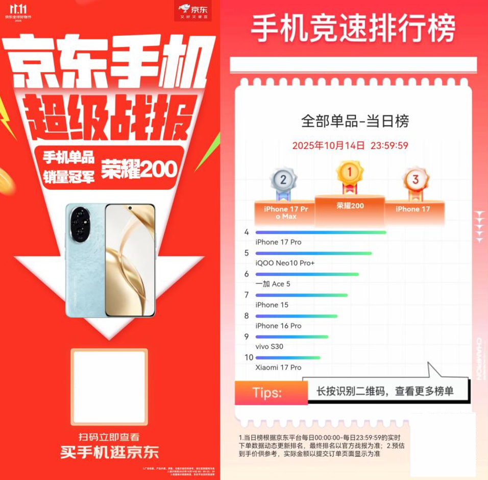 京東11.11手機競速榜競爭激烈 榮耀登頂10月14日品牌銷量榜第一