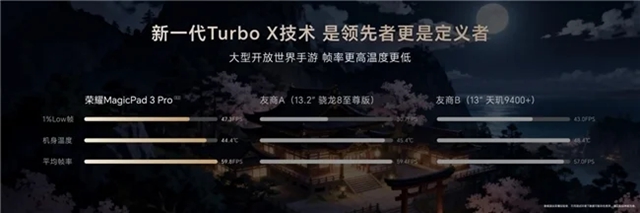 為了實現(xiàn)極致性能釋放,榮耀MagicPad3 Pro搭載13層冰封散熱系統(tǒng),導(dǎo)熱能力提升26%,并集成新一代Turbo X技術(shù),《鳴潮》游戲幀率與控溫表現(xiàn)均領(lǐng)先友商同級機(jī)型,《原神》可穩(wěn)定運(yùn)行120幀+2.6K分辨率的高畫質(zhì)設(shè)置,超分超幀表現(xiàn)達(dá)到業(yè)界超強(qiáng)。榮耀還聯(lián)合高通業(yè)界首發(fā)PC級Q-Sync技術(shù),對齊屏幕刷新率與游戲幀率,絲滑顯示無懼延遲撕裂,讓玩家看得爽,操控更爽。