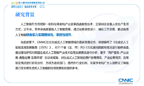 10月18日,中國(guó)互聯(lián)網(wǎng)絡(luò)信息中心(CNNIC)在2025(第六屆)中國(guó)互聯(lián)網(wǎng)基礎(chǔ)資源大會(huì)上發(fā)布《生成式人工智能應(yīng)用發(fā)展報(bào)告(2025)》(以下簡(jiǎn)稱《報(bào)告》)。中國(guó)互聯(lián)網(wǎng)絡(luò)信息中心副主任張曉對(duì)《報(bào)告》進(jìn)行了發(fā)布與解讀。