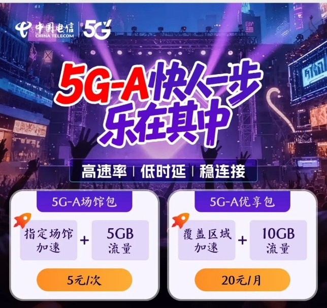 電信5G-A場館包按次訂購,內(nèi)含5G通用流量,并且已覆蓋江蘇省13地市各大場館,看演唱會、音樂節(jié),隨訂隨用。同時江蘇電信還貼心推出的20元10GB優(yōu)享月包,讓你用一杯奶茶錢,即可享受一個月5G-A極速服務(wù),還附帶全國通用大流量。 用“小小疊加包“,實現(xiàn)”體驗大升級”。 讓你無論在網(wǎng)絡(luò)上做什么,都快人一步,樂在其中。