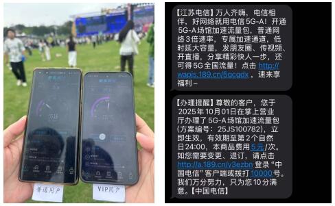 在數(shù)萬人密集的音樂節(jié)現(xiàn)場,率先加入體驗的南京樂迷小李用5G-A網(wǎng)絡(luò)開啟的高清直播全程無卡頓,“之前擔(dān)心人多網(wǎng)絡(luò)差,現(xiàn)在連4K畫質(zhì)都絲滑流暢。我剛拍下薛之謙的現(xiàn)場視頻,轉(zhuǎn)身就發(fā)了朋友圈,比身邊朋友快了足足半分鐘”。5G-A的飛速讓他成為朋友圈的“首評人”,此外,樂迷小李還有新發(fā)現(xiàn),他展示著手機上“電信場館VIP”的定制角標(biāo),這是辦理5G-A場館包后專屬的UE Logo標(biāo)識。 “真酷,太潮了!”