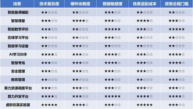 3. 梳理算力賦能教育行業(yè)典型應(yīng)用場景。“算力+教育”的應(yīng)用場景通過歸納主要分為四大部分,分別為教學(xué)場景、學(xué)習(xí)場景、管理場景以及科研場景,由于不同應(yīng)用場景之間存在差別以及技術(shù)層面的不同,因此不同場景的部署難度以及技術(shù)成熟度存在差異性。部署難度方面,不同應(yīng)用場景下,“算力+”的賦能模式需要結(jié)合技術(shù)復(fù)雜度、硬件依賴度、數(shù)據(jù)敏感度、場景適配成本以及政策合規(guī)情況進行部署難度的判斷,對四大類場景中的12個具體場景進行多維度的分析。