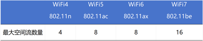 空間流可以理解為設(shè)備的天線,一條空間流對(duì)應(yīng)一根天線,空間流越多,則天線越多,整機(jī)吞吐量也越大。根據(jù)以下數(shù)據(jù)得到WiFi7空間流數(shù)最大16條。