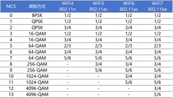 指編碼后有效數(shù)據(jù)占理論值的比例,F(xiàn)實(shí)物理世界無法按照理論的編碼方式無損地傳輸數(shù)據(jù),需要加入部分冗余信息作為校驗(yàn)數(shù)據(jù),用冗余換取可靠性。根據(jù)以下數(shù)據(jù)得到WiFi7編碼率最高是5/6。