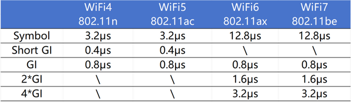 符號(hào)時(shí)間是Symbol時(shí)間與GI時(shí)間相加的和。Symbol表示一次傳輸?shù)臄?shù)據(jù),是時(shí)域上的傳輸信號(hào);GI是相鄰的兩個(gè)Symbol之間的時(shí)間空隙,以避免 Symbol 之間相互干擾。根據(jù)以下數(shù)據(jù)得到WiFi7最小符號(hào)時(shí)間是13.6us(12.8us+0.8us),也即0.0000136s。