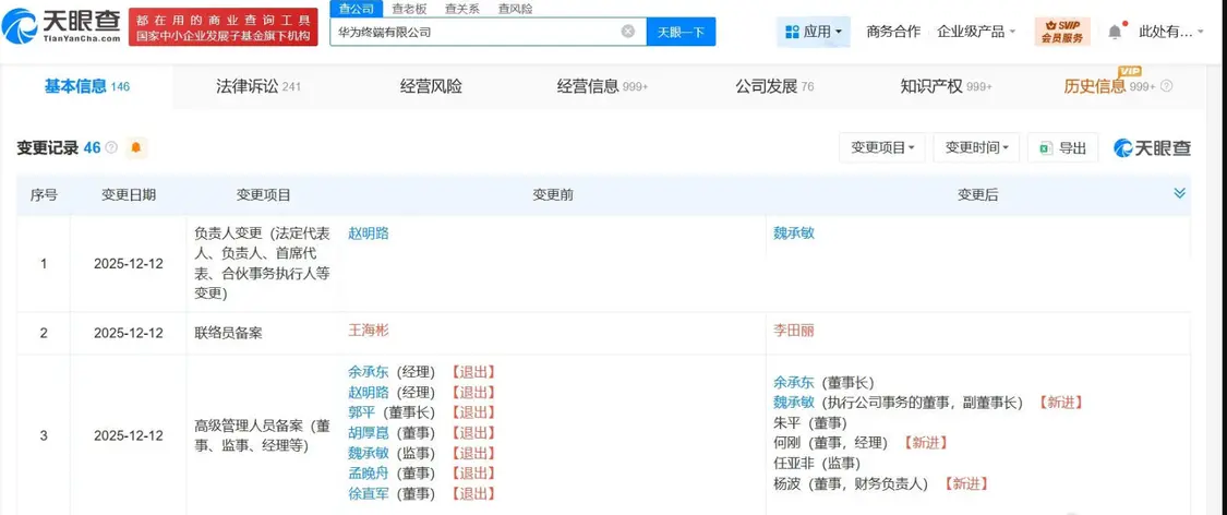 12月16日,天眼查工商信息顯示,近日,華為終端有限公司發(fā)生工商變更,原董事長(zhǎng)郭平卸任,由余承東接任董事長(zhǎng)一職,多位高管職務(wù)發(fā)生變更。