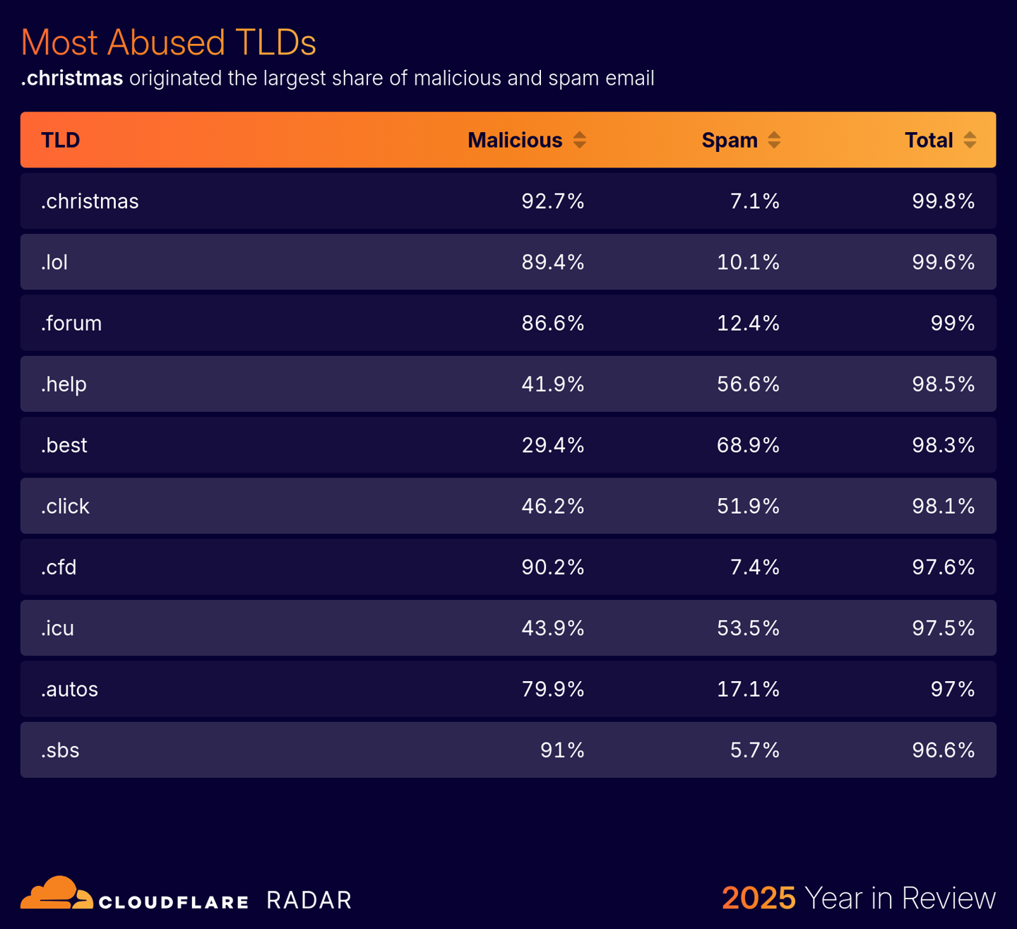 .christmas 和.lol 頂級(jí)域名發(fā)送的郵件中 99% 為垃圾或惡意郵件