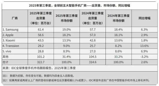 經(jīng)歷連續(xù)多年的市場調(diào)整后,全球智能手機(jī)行業(yè)在2025年迎來明確的復(fù)蘇信號(hào),這種復(fù)蘇并非簡單的量能回升,而是伴隨結(jié)構(gòu)優(yōu)化的高質(zhì)量增長。從全球市場來看,IDC公布數(shù)據(jù)顯示,今年第三季度全球智能手機(jī)出貨量同比增長2.6%,結(jié)束了此前的波動(dòng)調(diào)整態(tài)勢,復(fù)蘇動(dòng)力主要來自兩方面:一是積壓的換機(jī)需求逐步釋放,二是頭部廠商的AI創(chuàng)新與形態(tài)升級(jí)有效激活了消費(fèi)意愿,AI手機(jī)、AIPC、AI眼鏡等新形態(tài)設(shè)備加速落地,行業(yè)競爭從單一產(chǎn)品比拼,轉(zhuǎn)向以全場景體驗(yàn)為核心的生態(tài)構(gòu)建。