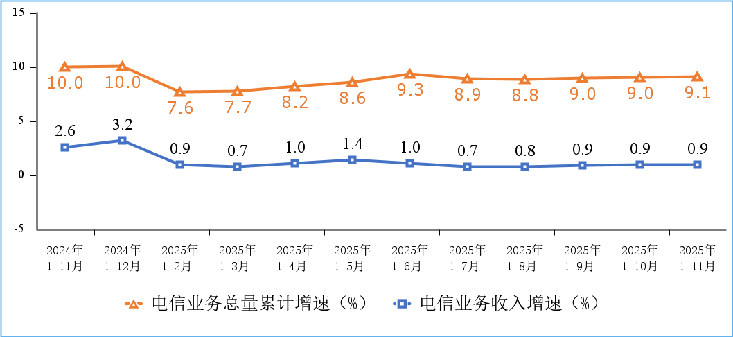 電信業(yè)務收入穩(wěn)步增長,電信業(yè)務總量小幅回升。前11個月,電信業(yè)務收入累計完成16096億元,同比增長0.9%。按照上年不變價計算的電信業(yè)務總量同比增長9.1%。