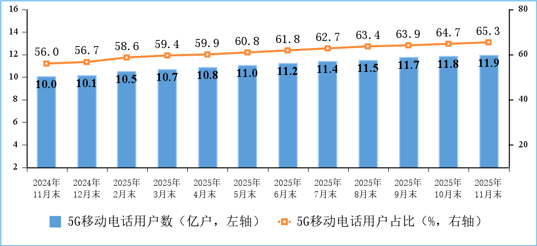 5G用戶規(guī)模持續(xù)擴大。截至11月末,三家基礎電信企業(yè)及中國廣電的移動電話用戶總數(shù)達18.28億戶,比上年末凈增3854萬戶。其中,5G移動電話用戶達11.93億戶,比上年末凈增1.79億戶,占移動電話用戶的65.3%。