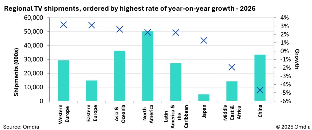 預計 2026 年增長最快的市場將出現(xiàn)在歐洲,其中西歐電視出貨量預計增長 3.2%,東歐出貨量預計增長 3.1%。作為賽事舉辦地的北美市場也有望實現(xiàn)穩(wěn)健增長,增幅約為 2.2%。
