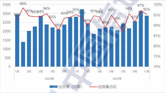 2025 年 11 月,智能手機出貨量 2875.1 萬部,同比增長 2.0%,占同期手機出貨量的 95.3%;智能手機上市新機型 24 款,同比下降 7.7%,占同期手機上市新機型數(shù)量的 77.4%。