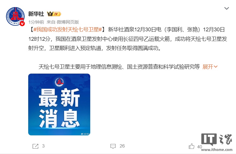 12 月 30 日消息,據(jù)新華社報(bào)道,12 月 30 日 12 時(shí) 12 分,我國(guó)在酒泉衛(wèi)星發(fā)射中心使用長(zhǎng)征四號(hào)乙運(yùn)載火箭,成功將天繪七號(hào)衛(wèi)星發(fā)射升空,衛(wèi)星順利進(jìn)入預(yù)定軌道,發(fā)射任務(wù)取得圓滿成功。