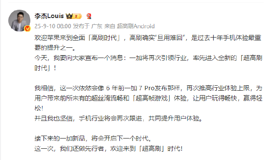 9月10日消息,一加中國區(qū)總裁李杰今日微博發(fā)文稱,歡迎蘋果來到全面‘高刷時代’。他表示,高刷確實(shí)“但用難回”,是過去十年手機(jī)體驗(yàn)最重要的提升之一。