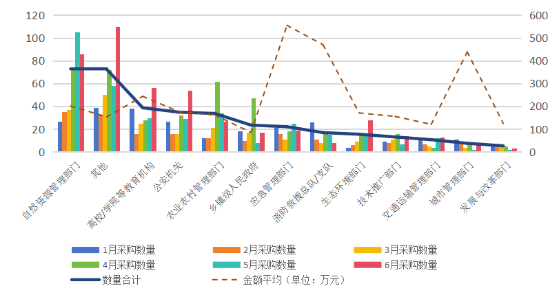 上半年公開投資采購市場整體呈現(xiàn)上升趨勢,自然資源管理和應(yīng)急管理部門采購需求最為旺盛。上半年公開采購累計發(fā)生1830起,已披露總金額達到39億元。其中五月采購金額位居榜首,占上半年全部采購金額的25%。自然資源管理部門和應(yīng)急管理部門上半年共計采購13億元,采購金額位居前二。此外,應(yīng)急管理、消防救援、城市管理等部門財力雄厚,平均采購金額位居前三。