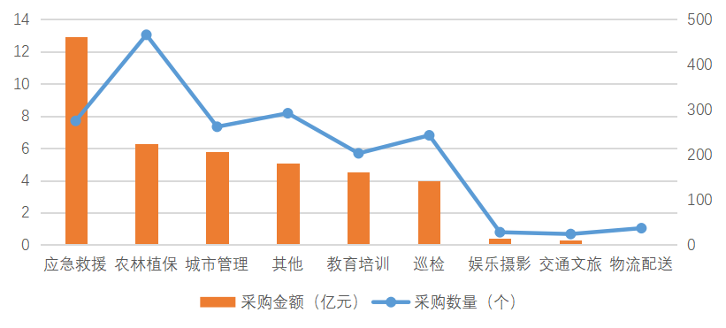 應(yīng)急救援和農(nóng)林植保是目前發(fā)展較為成熟的場景,應(yīng)急救援類相對單價更高。農(nóng)林植保上半年采購數(shù)量最多,共發(fā)生466起;應(yīng)急救援類場景采購金額最多,超12億元,其中無人機或直升機以及配件等硬件金額占比達90.6%。以政府主導(dǎo)的公共服務(wù)類場景如應(yīng)急救援等大單相對集中,與政策補貼資金流向相同,如應(yīng)急部門上半僅發(fā)生110次采購,平均每筆采購事件達到555萬元。行業(yè)類采購如農(nóng)林植保高頻小單較多,部分農(nóng)業(yè)公司提供防治等服務(wù),服務(wù)價格相對采購更低,依據(jù)防治面積定價(目前單價≤20元/畝)或隨采購農(nóng)藥產(chǎn)品搭售。