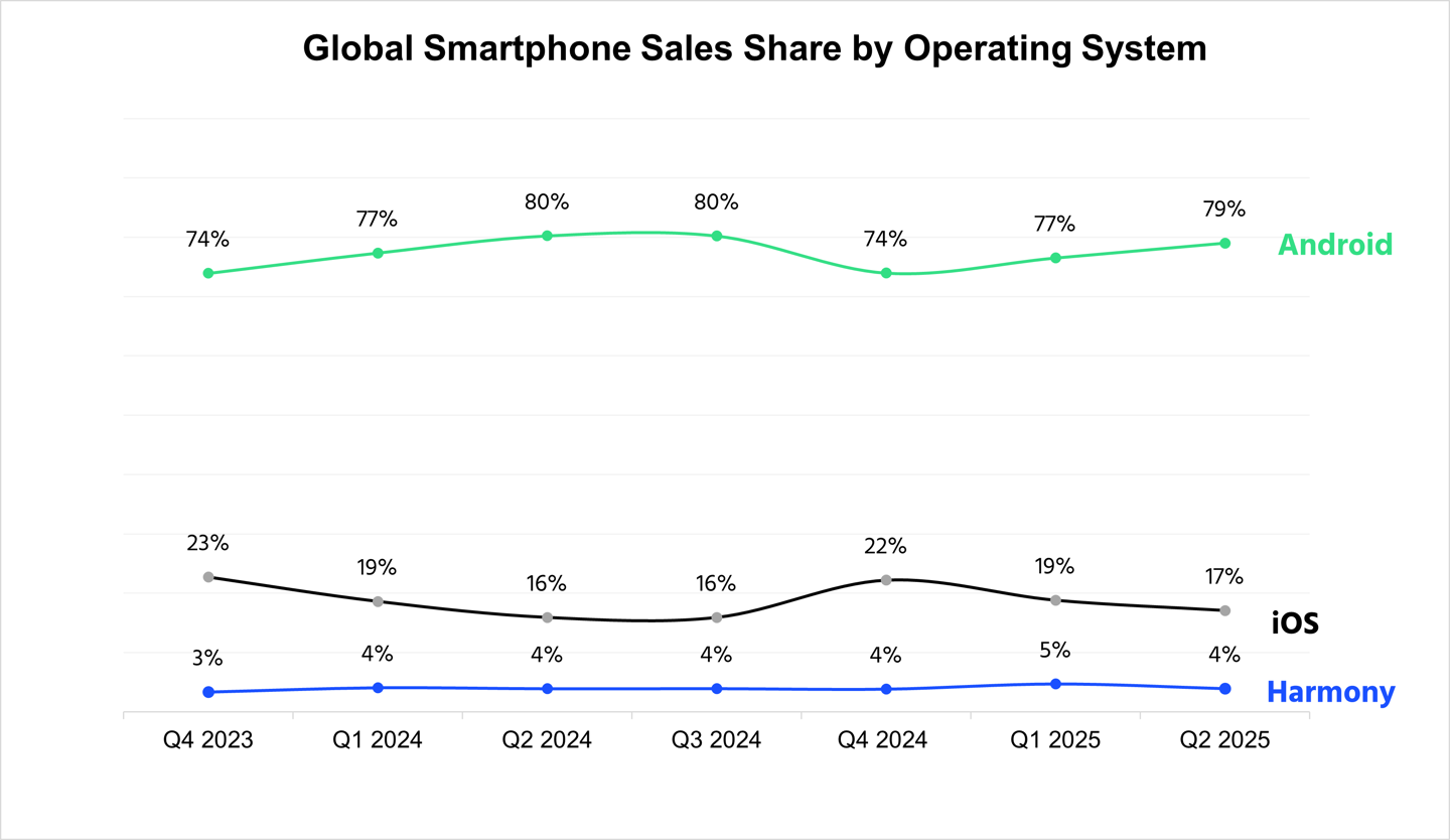 市場(chǎng)調(diào)查機(jī)構(gòu) CounterPoint Research 昨日(9 月 22 日)發(fā)布博文,報(bào)道稱在 2025 年第 2 季度全球智能手機(jī)銷量同比增長(zhǎng) 5%,其中安卓系統(tǒng)占比 79%,蘋果 iOS 系統(tǒng)占比 17%,鴻蒙系統(tǒng)占比 4%。