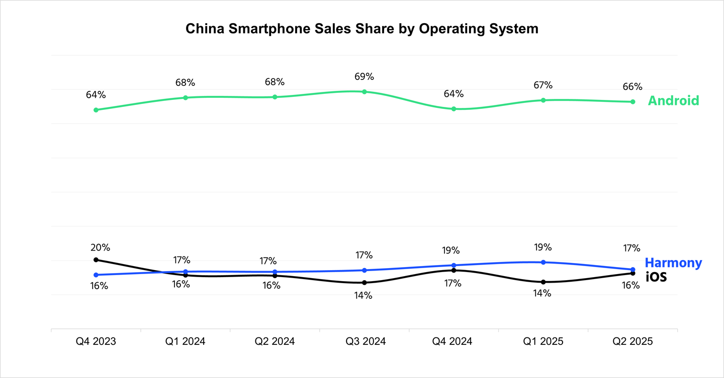 CounterPoint 報(bào)告中國(guó)手機(jī)系統(tǒng)份額:華為鴻蒙連續(xù) 6 個(gè)季度超蘋果 iOS 穩(wěn)居第二