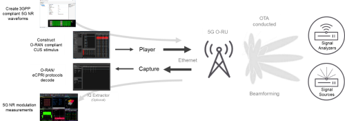 在硅后測(cè)試階段,測(cè)試訪問(wèn)控制主要限于O-RU的O-RAN和射頻端口。如圖3所示,要測(cè)試O-RU,需要具備:一個(gè)O-DU仿真器,用于發(fā)送和接收O-RAN端口上的CUSM平面信息;一個(gè)矢量信號(hào)分析儀,用于接收O-RU發(fā)送的下行射頻信號(hào);一個(gè)信號(hào)發(fā)生器,用于向O-RU發(fā)送上行信號(hào);非傳導(dǎo)測(cè)試可能還需要其他設(shè)備。所有這些測(cè)試設(shè)置組件都需要進(jìn)行時(shí)鐘對(duì)齊,并滿足嚴(yán)格的前傳測(cè)試定時(shí)要求。