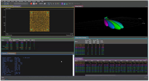 要測(cè)試大規(guī)模多輸入多輸出無(wú)線電單元,需要具備:O-DU模擬器,配備通過(guò)以太網(wǎng)接口生產(chǎn)、播放、捕獲和測(cè)量O-RAN流量的工具;多射頻收發(fā)器,用于在不同方向上產(chǎn)生帶有噪聲和干擾的波束,并同時(shí)接收信號(hào)。測(cè)試裝置不僅需要測(cè)量上行和下行鏈路方向的所有波束和信號(hào),還需要能夠精確定位波束賦形問(wèn)題。圖4顯示了帶幅度和相位權(quán)重的下行鏈路波束賦形示例,以及相應(yīng)的波束模式和EVM數(shù)據(jù)。