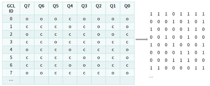 如圖1所示各隊(duì)列的門的開(kāi)/關(guān)狀態(tài)由GCL精確控制。GCL可以有多行,GCL根據(jù)基準(zhǔn)時(shí)間BaseTime,循環(huán)執(zhí)行,每CycleTime執(zhí)行一次。
