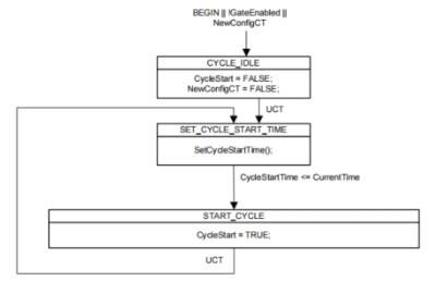 SetCycleStartTime()過(guò)程確定下一個(gè)GCL執(zhí)行周期開(kāi)始的時(shí)間。該過(guò)程根據(jù)Current Time、Oper Base Time、Oper Cycle Time、Oper Cycle Time Extension、Config Change Time和Config Pending的值,將Cycle Start Time變量設(shè)置為起始時(shí)間,具體規(guī)則如下: