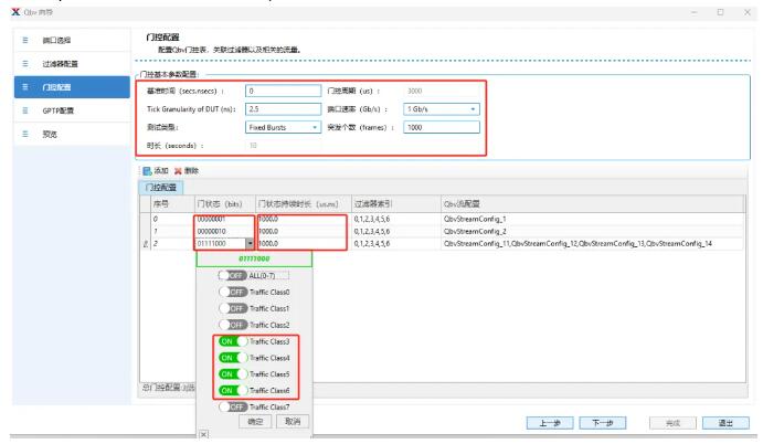 門控中依次添加三個(gè)GCL列表項(xiàng),門狀態(tài)中指定門狀態(tài),0為關(guān)門,1為開(kāi)門。列表0放行優(yōu)先級(jí)0流量、列表1放行優(yōu)先級(jí)1流量、列表2放行3、4、5、6優(yōu)先級(jí)流量。門狀態(tài)持續(xù)時(shí)長(zhǎng)設(shè)置每個(gè)列表的持續(xù)時(shí)間,所有列表持續(xù)時(shí)間之和為Oper Cycle Time此例設(shè)置每個(gè)GCL持續(xù)時(shí)間為1ms,Oper Cycle Time為3ms;過(guò)濾器索引為測(cè)試儀統(tǒng)計(jì)不同GCL放行流量的落點(diǎn)情況。(門控規(guī)則與DUT保持一致)