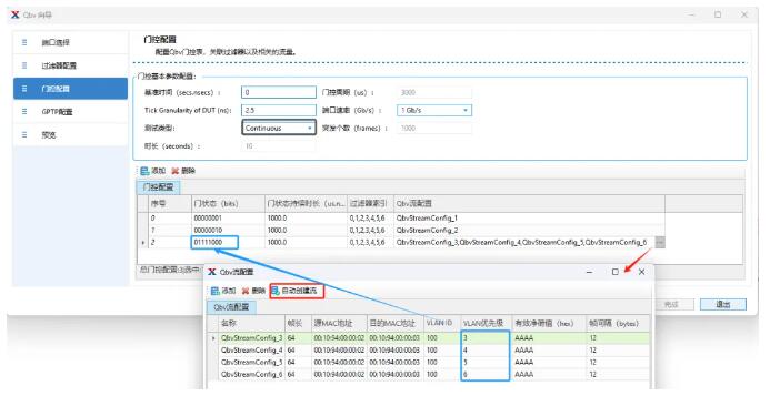 配置Qbv流量,點(diǎn)擊自動(dòng)創(chuàng)建流量會(huì)自動(dòng)生成對(duì)應(yīng)優(yōu)先級(jí)的Qbv流,也可以點(diǎn)擊“添加”手動(dòng)創(chuàng)建其他流量,配置測(cè)試類型為Continuous。