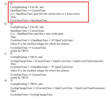 3、Config Pending=TRUE,且Config Change Time>(Current Time+Oper Cycle Time+Oper Cycle Time Extension)那么Cycle StartTime=(Oper Base Time+N*Oper Cycle Time)其中N是滿足關(guān)系式的最小整數(shù);