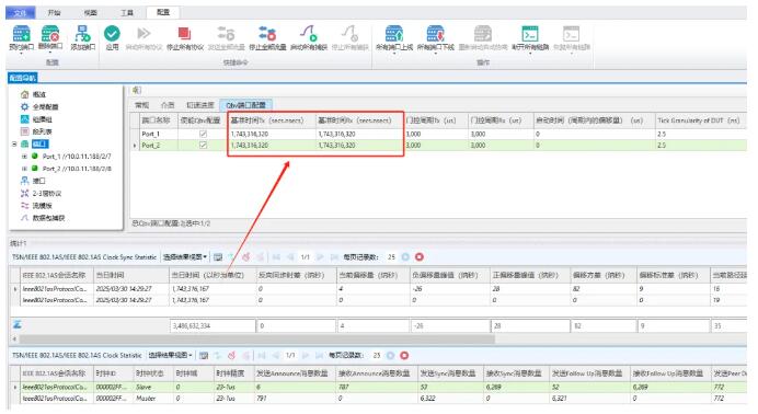 配置AS協(xié)議并點(diǎn)擊完成,在配置導(dǎo)航欄中可看到生成的AS協(xié)議,點(diǎn)擊啟動(dòng)所有協(xié)議,能看到測(cè)試儀Telkerd端口AS時(shí)鐘狀態(tài)為Slave,Listener端口AS時(shí)鐘狀態(tài)為Master,統(tǒng)計(jì)中能看到時(shí)間偏移量及協(xié)議包交互數(shù)量均正常,時(shí)間同步是Qbv調(diào)度基準(zhǔn)時(shí)間的基石,需優(yōu)先確保其建立成功。