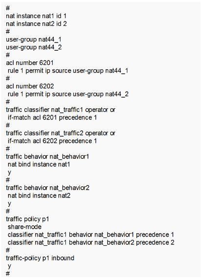 UP側(cè)配置兩個NAT實例,port-range為1600,每個實例配置1024個公網(wǎng)地址,分別對應(yīng)Bras業(yè)務(wù)板上下子卡的各10個用戶接入端口;CP側(cè)配置相應(yīng)NAT實例、user-group、acl、cb對、上線域等。關(guān)鍵配置如下: