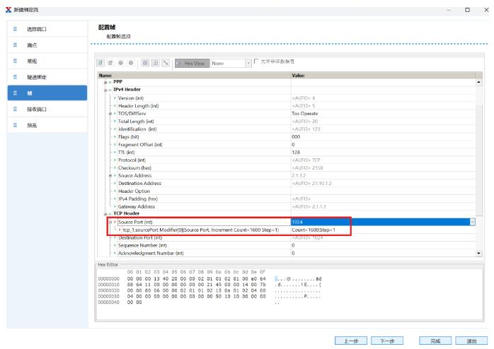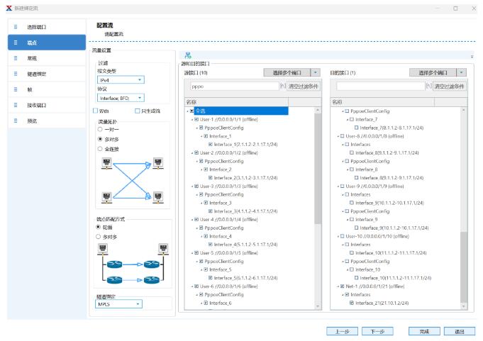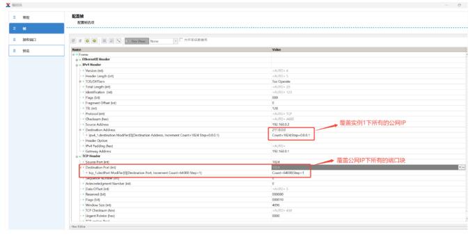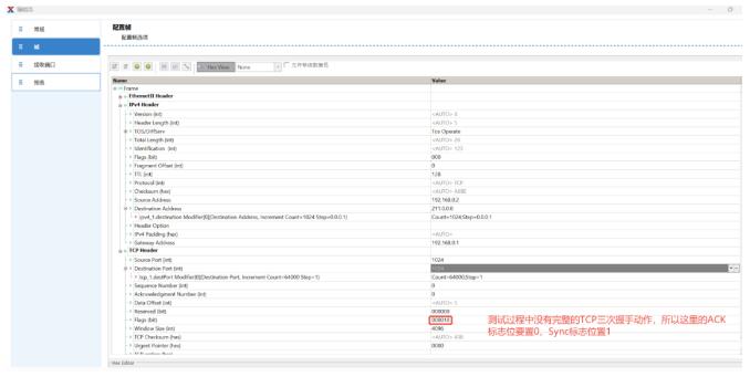 創(chuàng)建用戶側(cè)到網(wǎng)絡(luò)側(cè)的上行流量,添加UDP/TCP頭,設(shè)置源端口跳變,使每個用戶打滿端口塊,實現(xiàn)最大并發(fā)session數(shù)測試: