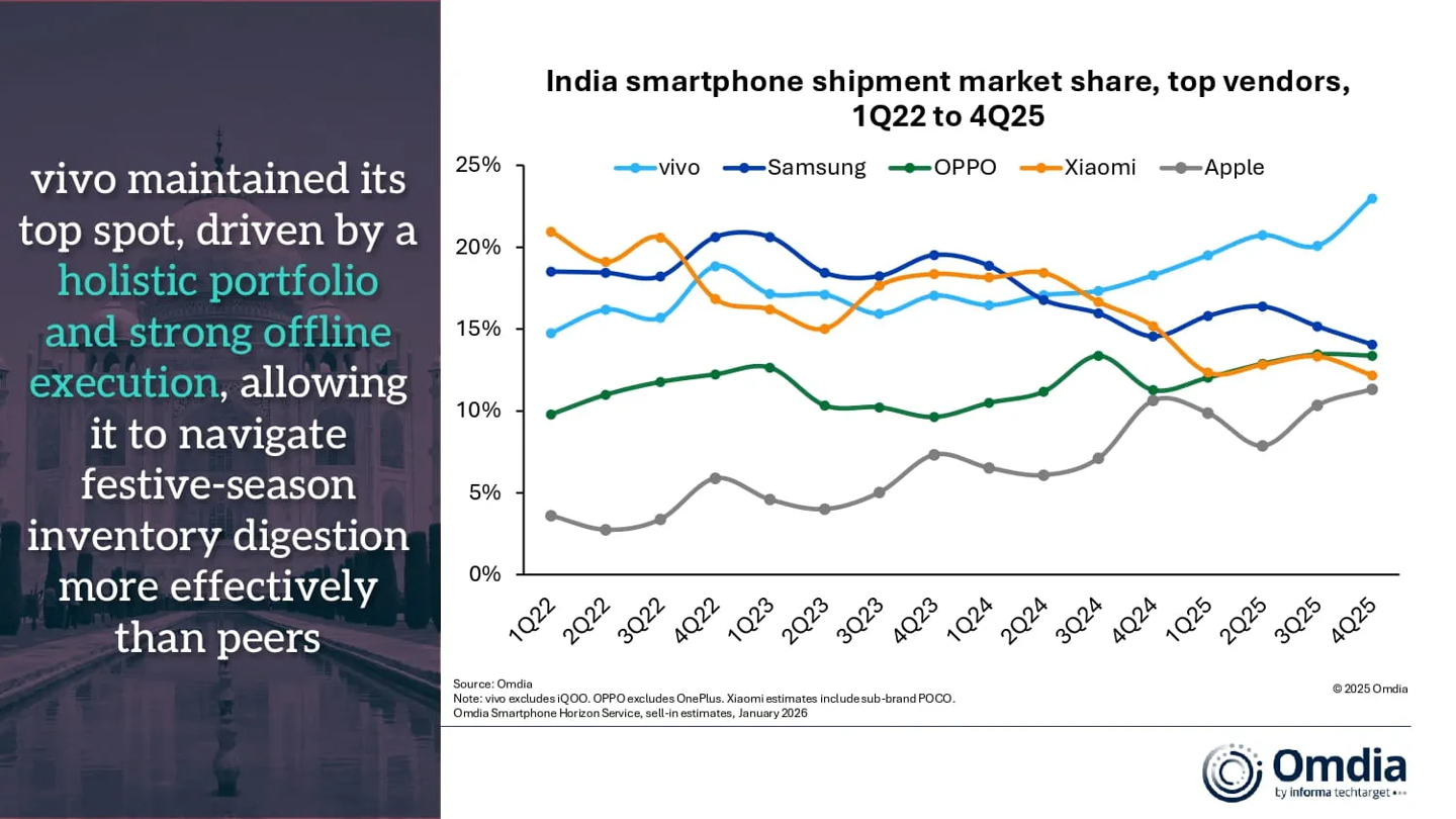 Omdia 報(bào)告 2025 印度手機(jī)出貨量:vivo 同比增 19% 傲視群雄