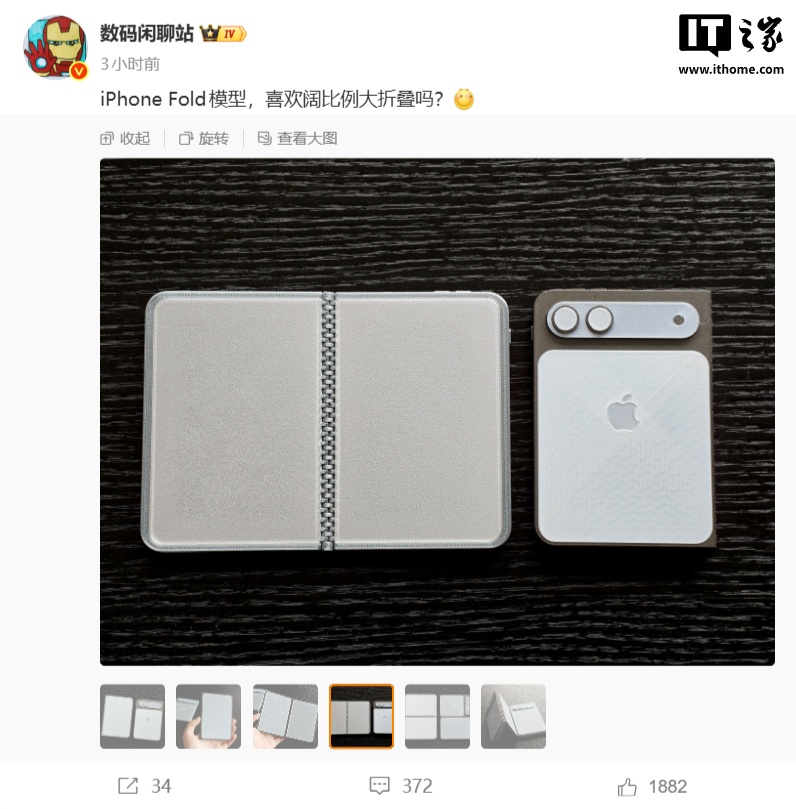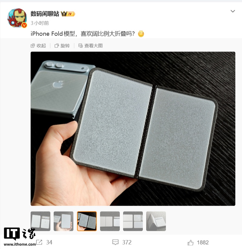 博主 @數(shù)碼閑聊站 今日曬出了 iPhone Fold 手機的模型,可以看到機身的外觀設(shè)計采用闊比例 + 內(nèi)外雙屏。
