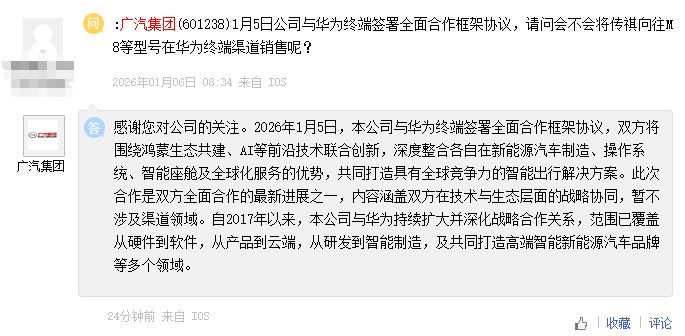 廣汽集團:與華為合作暫不涉及渠道領(lǐng)域