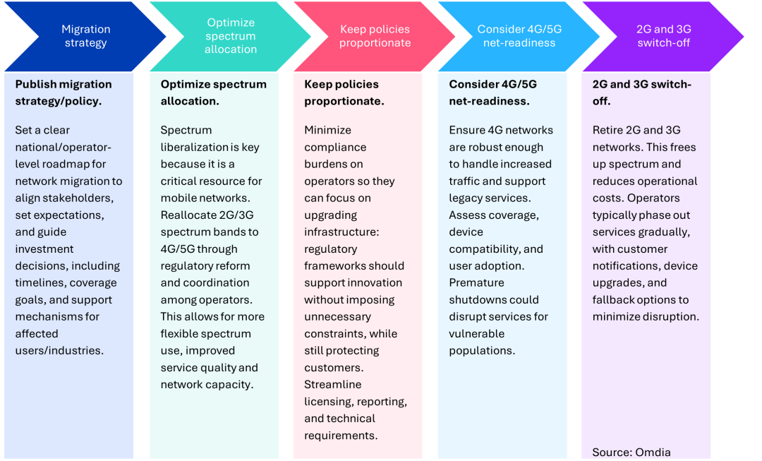 McBride指出:“隨著2G與3G加速退網(wǎng),消費者保護已成為監(jiān)管機構的主要關注點。老年人、農村人口、IoT用戶以及使用遺留設備的用戶面臨最大服務中斷風險。為此,監(jiān)管機構開始要求實施清晰透明的溝通策略,包括退網(wǎng)時間表、替代服務方案、遷移計劃以及技術支持,以確保平穩(wěn)過渡。”