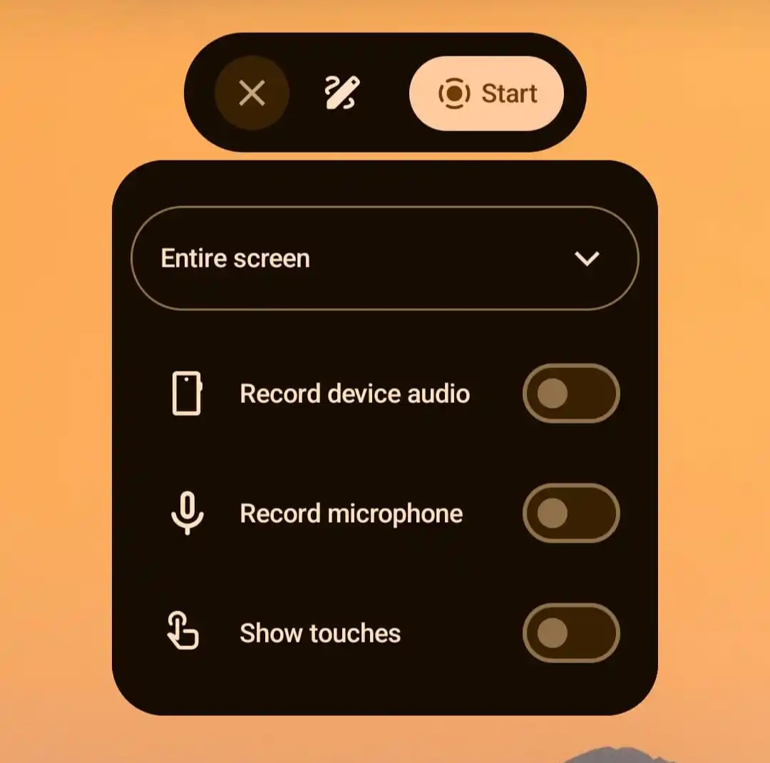 交互方面,新版錄屏工具不再以全屏彈窗形式遮擋視線,而是啟用了一個(gè)更為輕量的懸浮膠囊(Floating Pill)界面。用戶在選擇“錄制全屏”后,可快速切換錄制設(shè)備音頻、麥克風(fēng)聲音及顯示觸摸操作等選項(xiàng)。