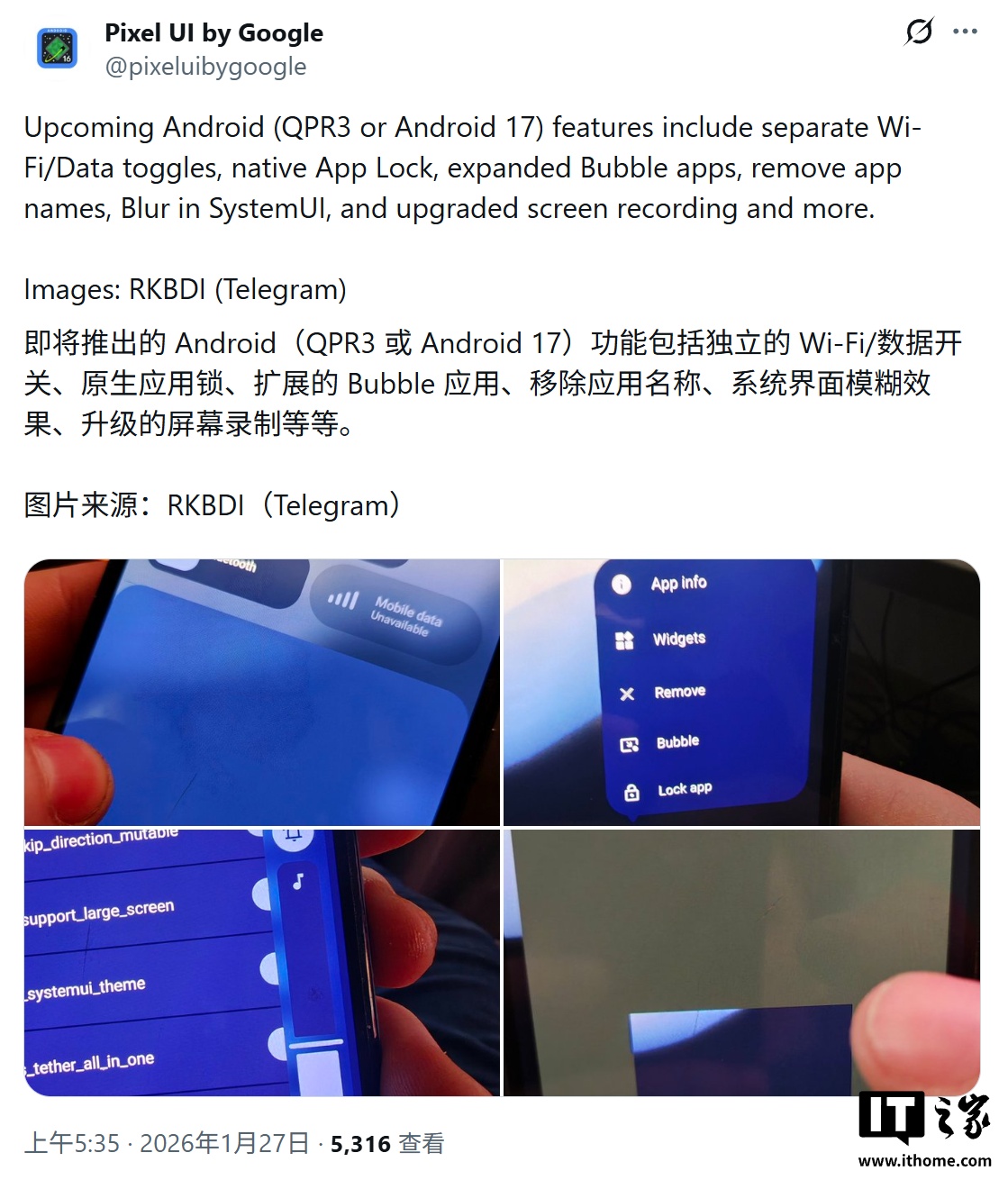 1 月 27 日消息,消息源 @RKBDI 今天(1 月 27 日)在 X 平臺(tái)發(fā)布推文,分享了一組截圖,展示了谷歌安卓 17 內(nèi)部構(gòu)建版本,聚焦 UI 視覺與功能交互上的變化。