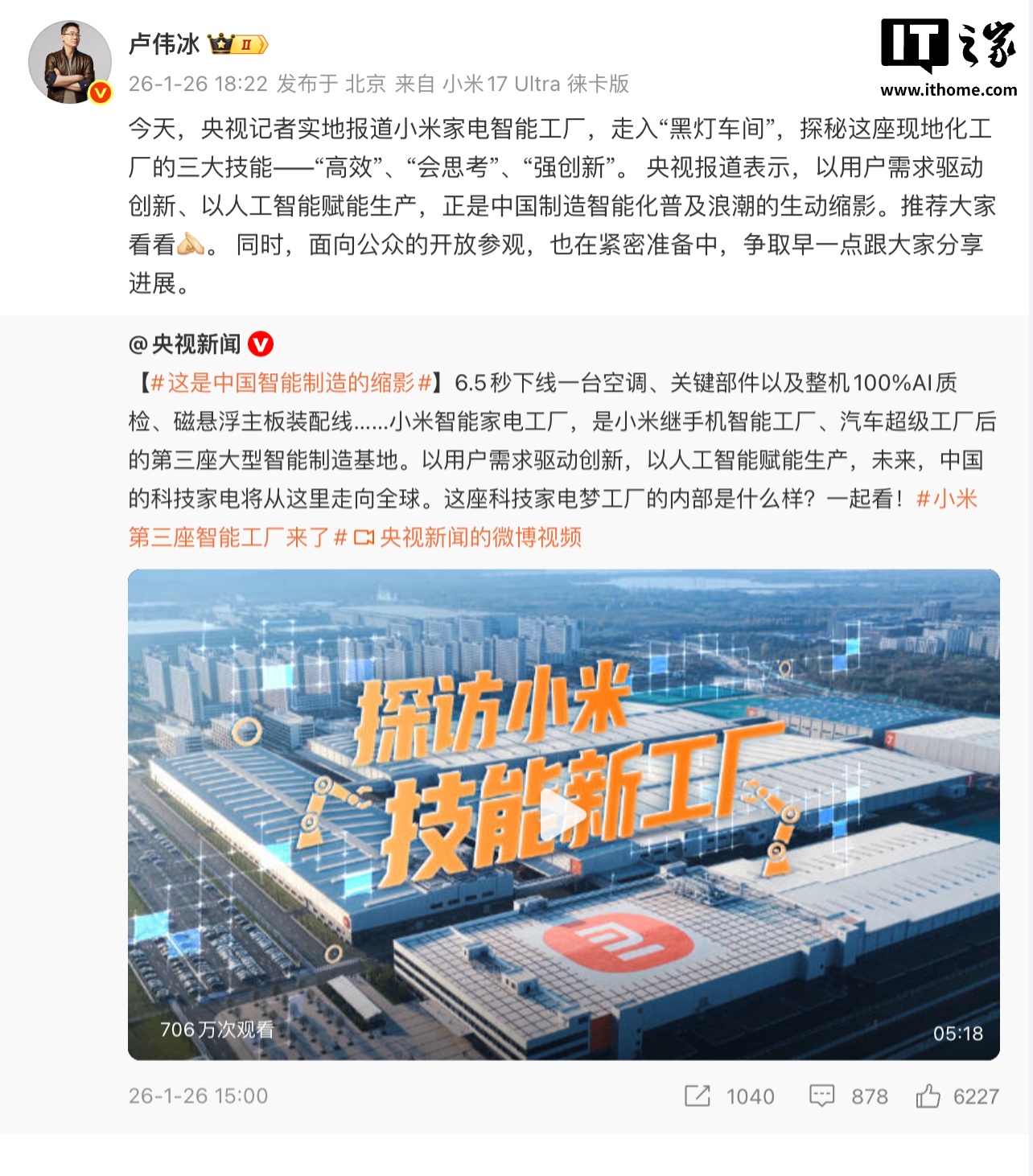 1 月 26 日消息,今天晚間,小米集團(tuán)合伙人、總裁,手機(jī)部總裁,小米品牌總經(jīng)理盧偉冰轉(zhuǎn)發(fā)央視新聞“探訪(fǎng)小米技能新工廠(chǎng)”的報(bào)道并透露,小米智能家電工廠(chǎng)面向公眾的開(kāi)放參觀(guān),也在緊密準(zhǔn)備中,爭(zhēng)取早一點(diǎn)跟大家分享進(jìn)展。