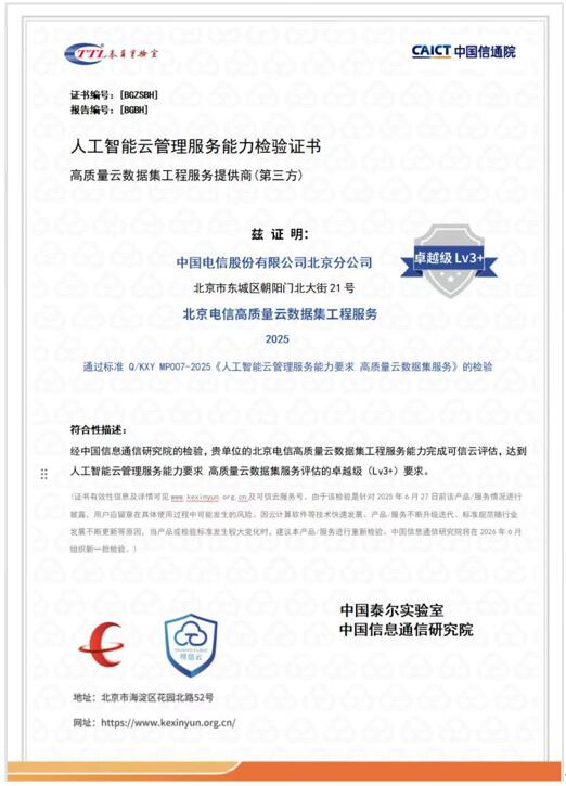 數(shù)據(jù)集的價(jià)值最終體現(xiàn)在應(yīng)用。在去年7月,北京電信率先通過中國信通院AI Cloud MSP模型工程化交付能力、高質(zhì)量云數(shù)據(jù)集工程服務(wù)能力雙項(xiàng)卓越級Lv3+認(rèn)證,成為運(yùn)營商最高評級獲得者。