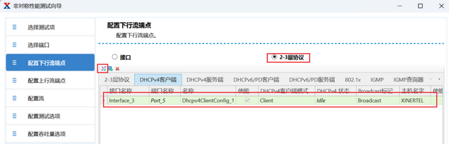 在這里也可以設(shè)置L23協(xié)議接口,例如DHCPv4,模擬用戶PC獲得DHCPv4地址后使用DHCPv4地址作為端點(IPv6/雙棧用戶都支持)。大多數(shù)情況下,上行流端點是模擬下掛在ONU用戶側(cè)的PC,這個方向使用DHCPv4/v6接口或雙棧。下行流端點模擬的OLT上聯(lián)設(shè)備,這個方向一般使用V4/V6接口。