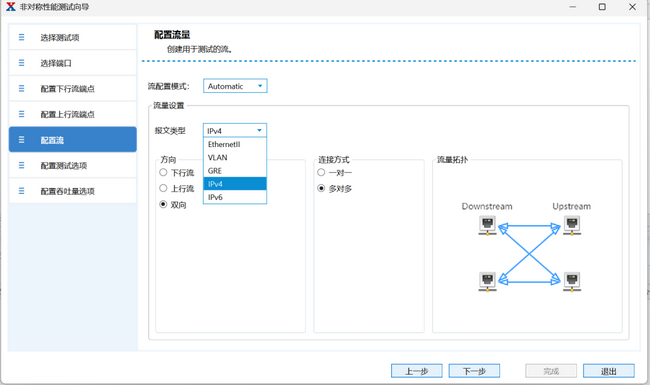 Automatic(自動模式):根據(jù)報文類型(IPv4/IPv6/EthernetII/VLAN/GRE 等)、流量方向(上行 / 下行 / 雙向)及連接方式,自動創(chuàng)建測試流量,支持一對一、多對多等流量拓?fù)洹?/P>