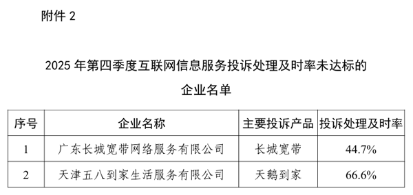 在互聯(lián)網(wǎng)信息服務(wù)投訴方面,2025年第四季度,互聯(lián)網(wǎng)信息服務(wù)投訴平臺收到的互聯(lián)網(wǎng)用戶投訴中,服務(wù)功能類投訴占比46.2%,個人信息保護(hù)類投訴占比18.6%,客服渠道類投訴占比15.5%。在178家頭部互聯(lián)網(wǎng)企業(yè)中,廣東長城寬帶、天鵝到家等2家企業(yè)投訴處理及時率較低,已督促相關(guān)企業(yè)妥善處理用戶反映的問題。