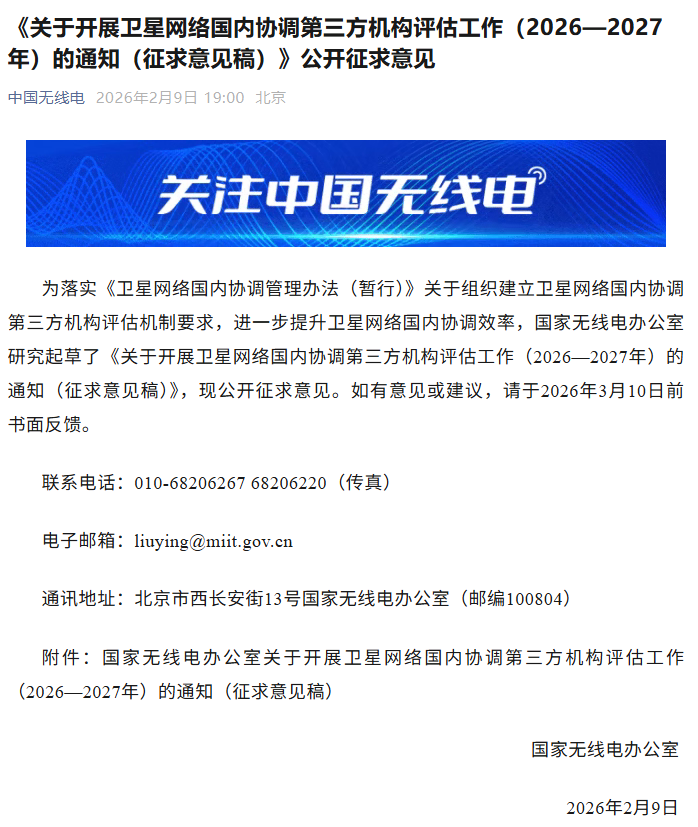 2 月 9 日消息,今日,國家無線電辦公室發(fā)布通知,為落實(shí)《衛(wèi)星網(wǎng)絡(luò)國內(nèi)協(xié)調(diào)管理辦法(暫行)》關(guān)于組織建立衛(wèi)星網(wǎng)絡(luò)國內(nèi)協(xié)調(diào)第三方機(jī)構(gòu)評估機(jī)制要求,進(jìn)一步提升衛(wèi)星網(wǎng)絡(luò)國內(nèi)協(xié)調(diào)效率,國家無線電辦公室研究起草了《關(guān)于開展衛(wèi)星網(wǎng)絡(luò)國內(nèi)協(xié)調(diào)第三方機(jī)構(gòu)評估工作(2026—2027 年)的通知(征求意見稿)》,現(xiàn)公開征求意見。