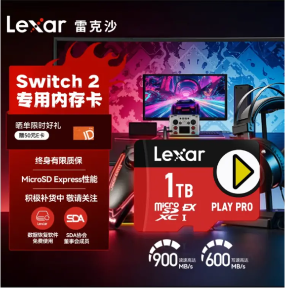 Lexar雷克沙的PLAY PRO microSD Express存儲卡則是專為 Switch 2量身定制的存儲利器。其讀取速度高達(dá)900MB/s,寫入速度600MB/s,能夠確保游戲快速加載,避免因讀取延遲影響沉浸式體驗(yàn)。容量方面提供256GB至1TB多種選擇,其中1TB版本可存儲約100個(gè)游戲,足以滿足資深玩家的海量存儲需求。