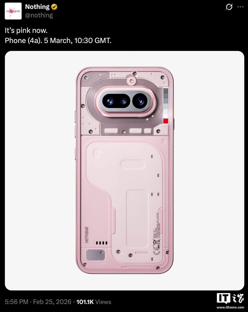 2 月 25 日消息,Nothing 官方今天在 X 平臺發(fā)文,公布 Phone (4a) 手機粉色版外觀,重申該機將于 3 月 5 日正式發(fā)布。