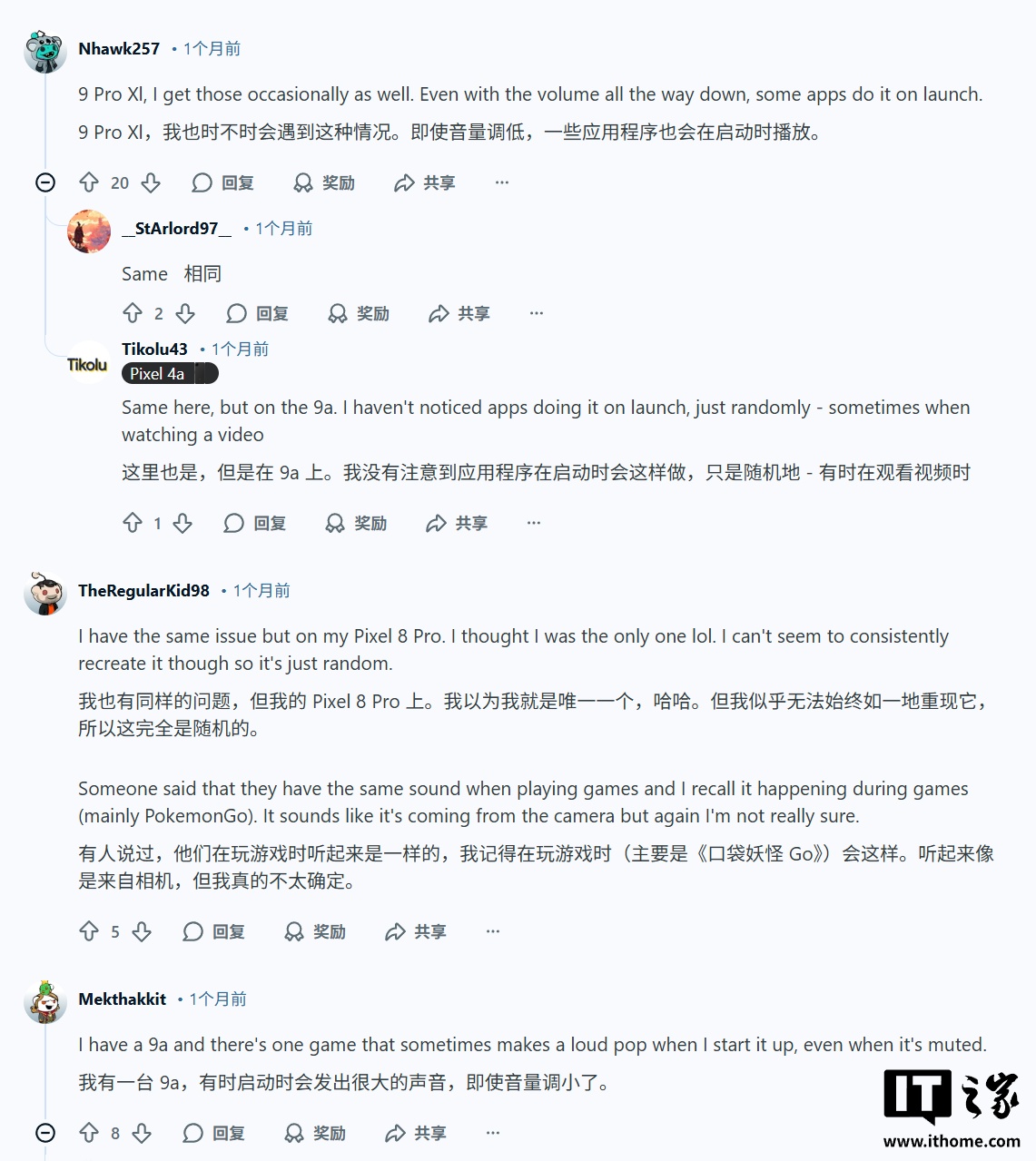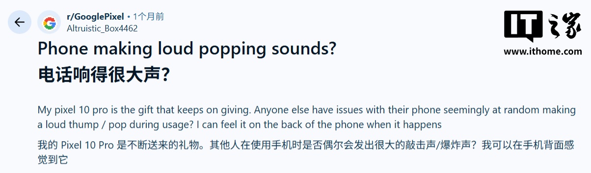 根據(jù)多名用戶(hù)在 Reddit 社區(qū)發(fā)文,這些爆音是隨機(jī)出現(xiàn)的,而且音量飄忽不定有時(shí)候可能會(huì)相當(dāng)響,隨后有許多用戶(hù)在評(píng)論區(qū)表示,自己的 Pixel 10 Pro、Pixel 9、Pixel 8 和 Pixel 7 都遇到了類(lèi)似問(wèn)題,表明這種故障并非局限于某一款機(jī)型。