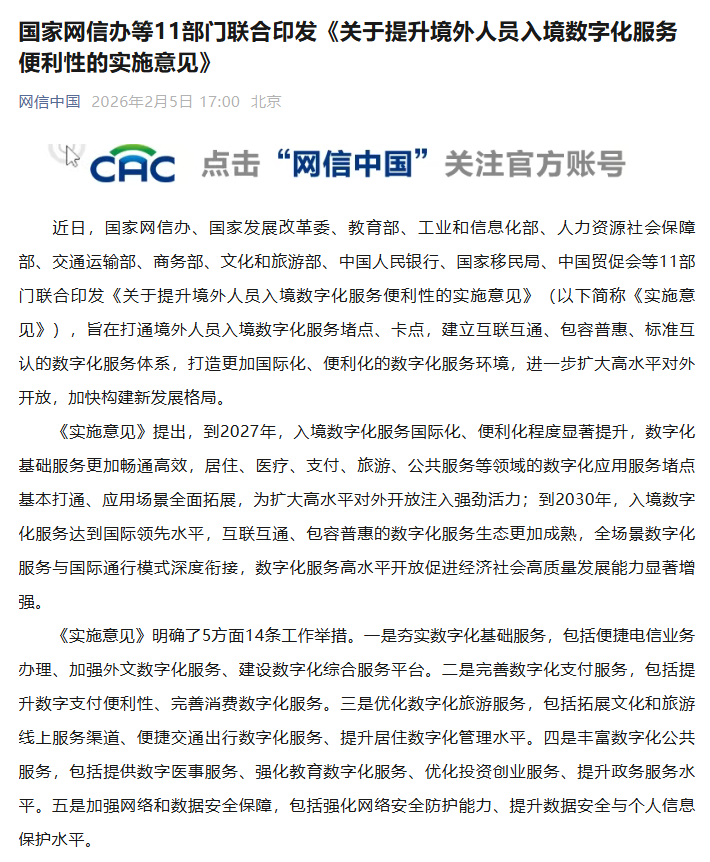 2 月 5 日消息,近日,國家網(wǎng)信辦、國家發(fā)展改革委、教育部、工業(yè)和信息化部、人力資源社會保障部、交通運(yùn)輸部、商務(wù)部、文化和旅游部、中國人民銀行、國家移民局、中國貿(mào)促會等 11 部門聯(lián)合印發(fā)《關(guān)于提升境外人員入境數(shù)字化服務(wù)便利性的實施意見》(以下簡稱《實施意見》),旨在打通境外人員入境數(shù)字化服務(wù)堵點、卡點,建立互聯(lián)互通、包容普惠、標(biāo)準(zhǔn)互認(rèn)的數(shù)字化服務(wù)體系,打造更加國際化、便利化的數(shù)字化服務(wù)環(huán)境,進(jìn)一步擴(kuò)大高水平對外開放,加快構(gòu)建新發(fā)展格局。
