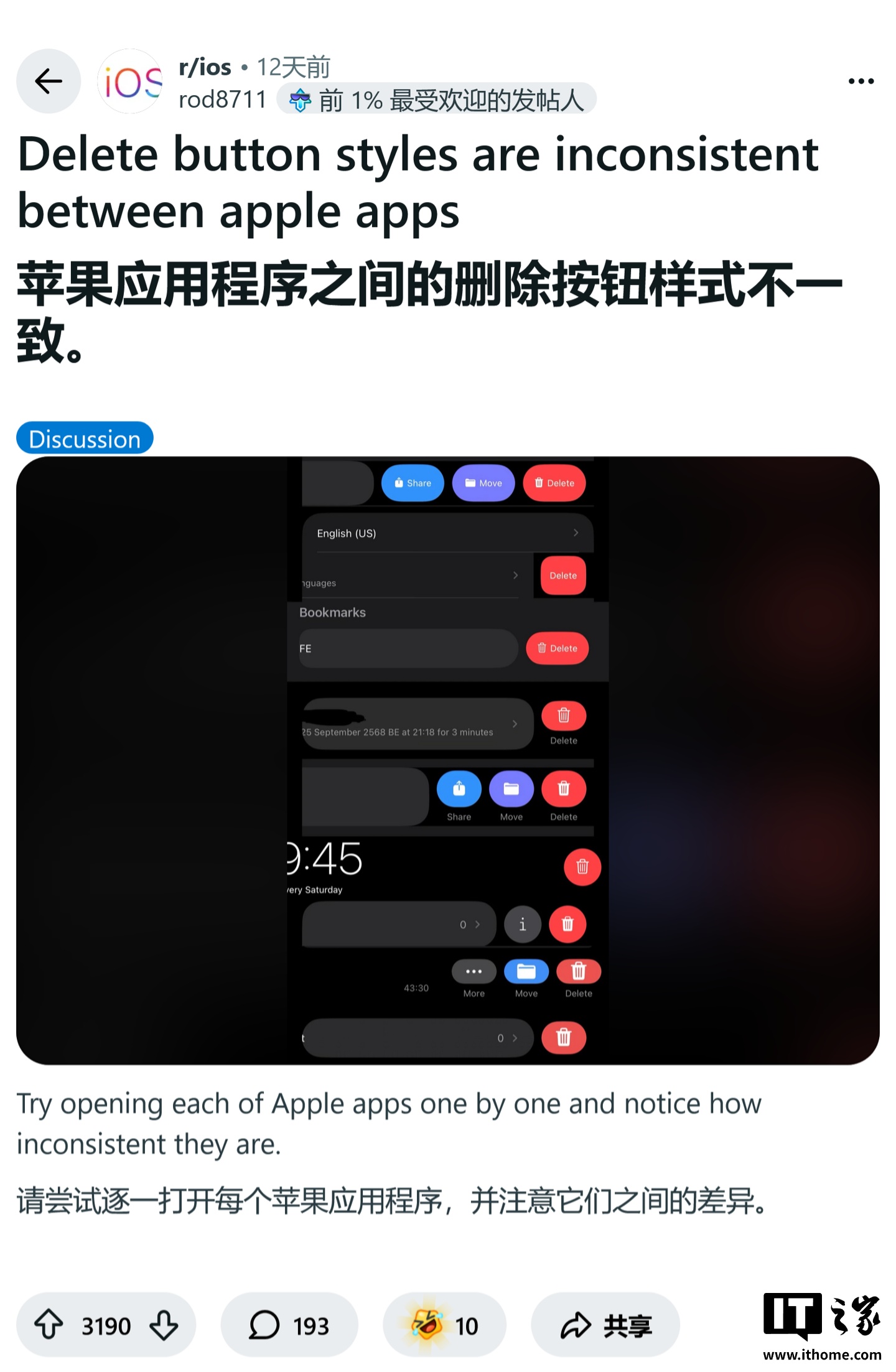 iPhone 17 等部分用戶指出,在郵件(Mail)、照片(Photos)、設(shè)置(Settings)及備忘錄(Notes)等原生應(yīng)用中,執(zhí)行刪除操作的按鈕樣式、位置及交互邏輯竟完全不同。IT之家附上帖子截圖如下: