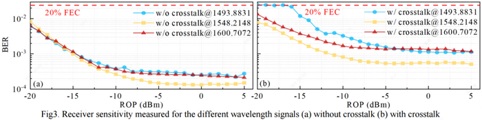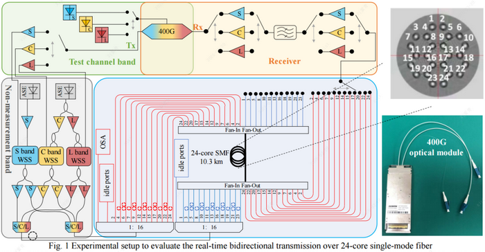 在空分復(fù)用方面,寬帶WDM信號(hào)經(jīng)分光器復(fù)制為多路,并通過扇入扇出器件耦合進(jìn)入24芯單模光纖,實(shí)現(xiàn)空間信道擴(kuò)展。同時(shí),纖芯采用雙向傳輸設(shè)計(jì),相鄰信道傳輸方向相反,有效抑制串?dāng)_,使系統(tǒng)在無需復(fù)雜MIMO處理的情況下穩(wěn)定運(yùn)行。在接收端,通過可調(diào)濾波器選取目標(biāo)信道,并由商用400G模塊進(jìn)行實(shí)時(shí)接收與解調(diào),完成BER及接收靈敏度測(cè)試。